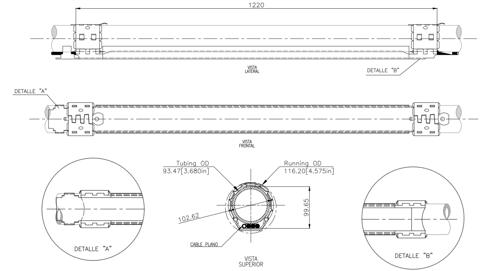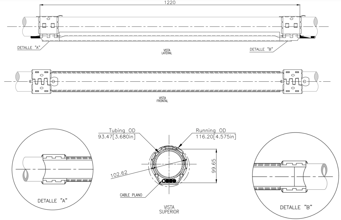 Material ASTM A-36/A1011 Espesor 3 mm Aplicaciones Power Cable 1 2 4 Capilar 1 2 1 2 1 2 OD Tubería Canal (AxE) 3,68 in 25x56 x x x Protector Dimensiones Chaqueta Superior Dimensiones Chaqueta Inferior