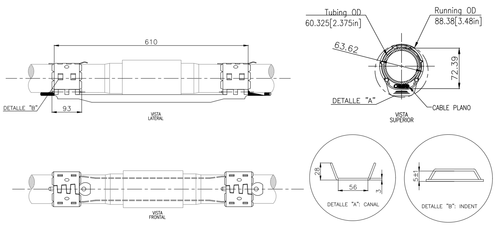Material ASTM A-36/A1011 Espesor 3 mm Aplicaciones Power Cable 1 2 4 Tipo Rosca Capilar 1 2 1 2 1 2 OD Tubería Canal 2 3/8 in 25x56 x x x Coupling EUE - VAN - N VAN - SEC - BTC Protector Mid Joint