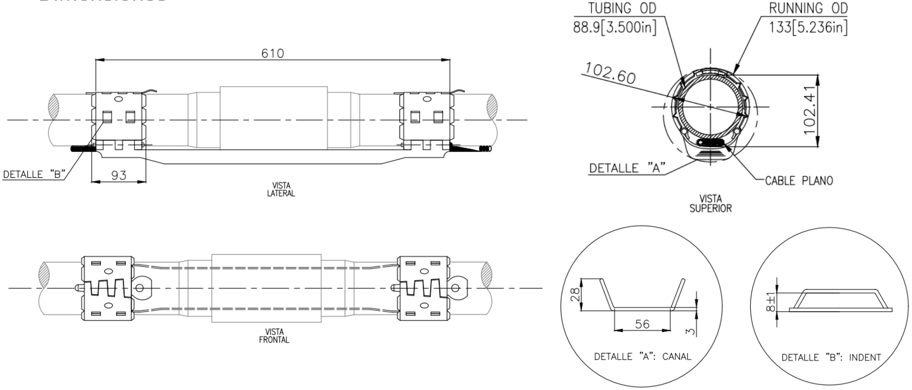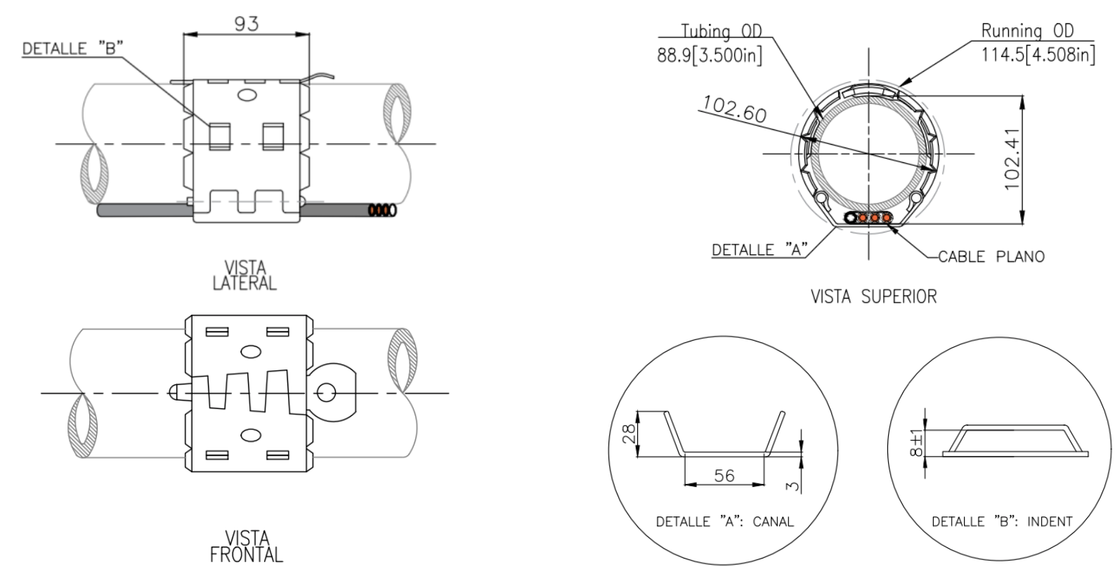 Material ASTM A-36/A1011 Espesor 3 mm Aplicaciones Power Cable 1 2 4 Tipo Rosca Capilar 1 2 1 2 1 2 OD Tubería Canal 3 1/2 in 25x56 x x x Coupling EUE - VAN - N VAN - SEC - BTC Protector Mid Joint