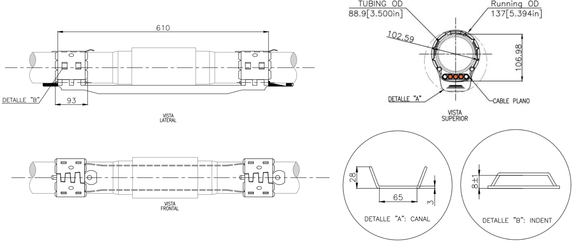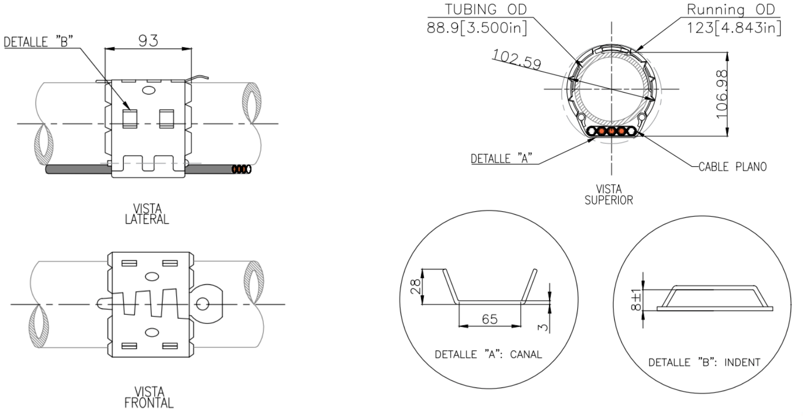 Material ASTM A-36/A1011 Espesor 3 mm Aplicaciones Power Cable 1 2 4 Tipo Rosca Capilar 1 2 1 2 1 2 OD Tubería Canal 3 1/2 in 25x65 x x x x x Coupling EUE - VAN - N VAN - SEC - BTC Protector Mid Joint