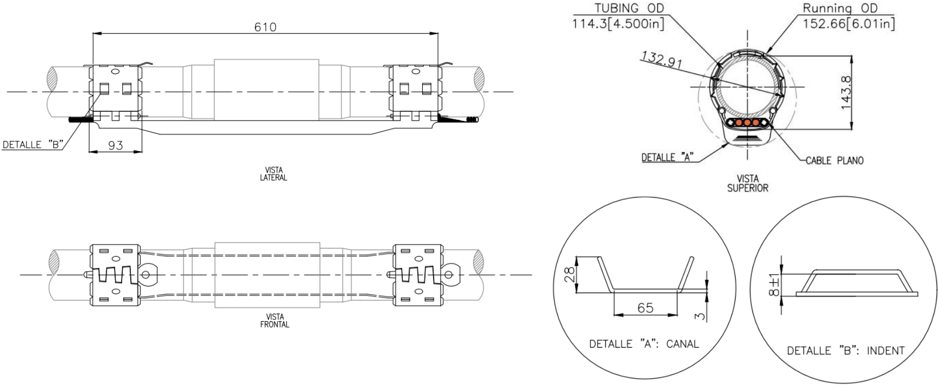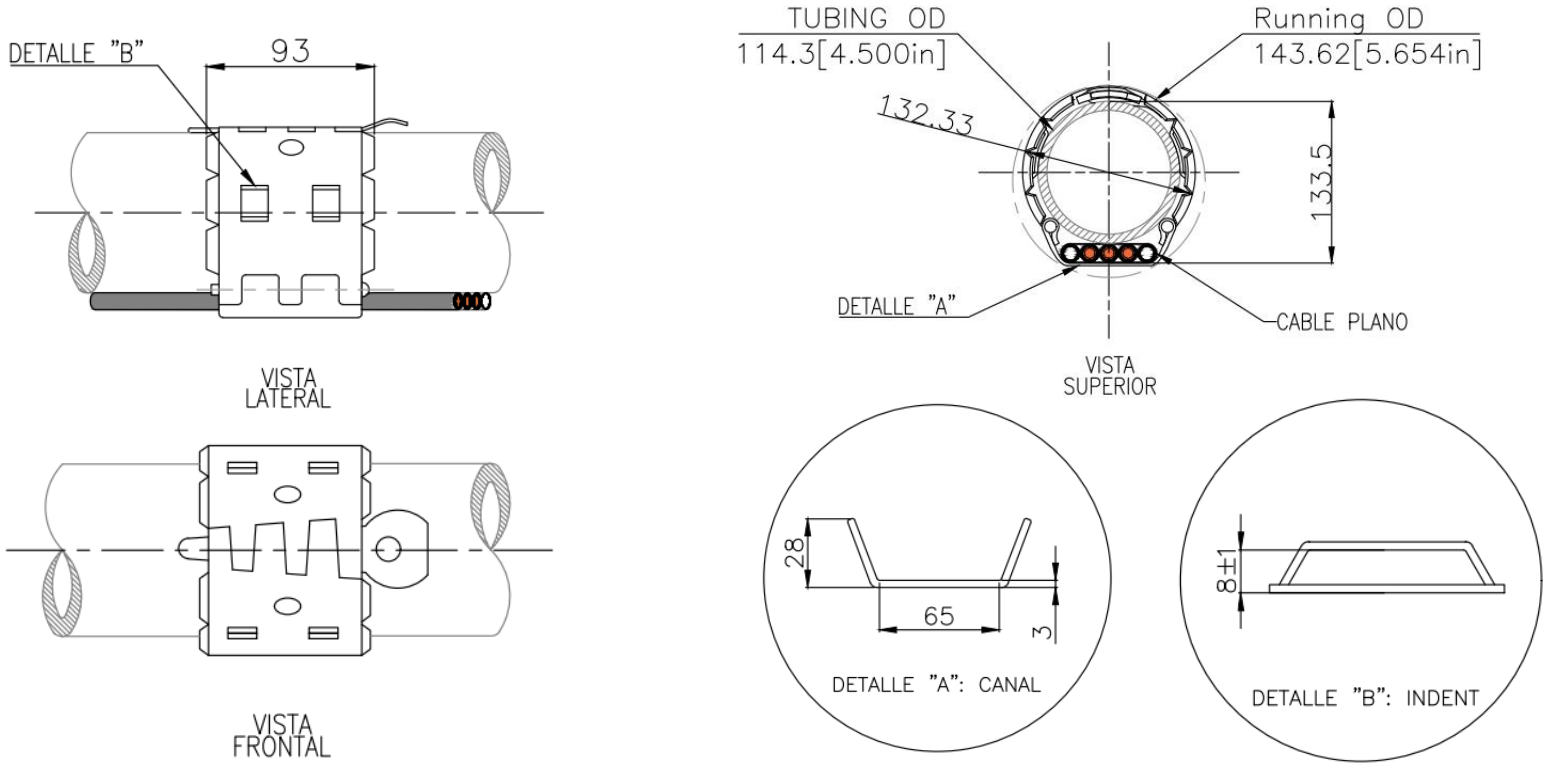 Material ASTM A-36/A1011 Espesor 3 mm Aplicaciones Power Cable 1 2 4 Tipo Rosca Capilar 1 2 1 2 1 2 OD Tubería Canal 4 1/2 in 25x65 x x x x x Coupling EUE - VAN - N VAN - SEC - BTC Protector Mid Joint