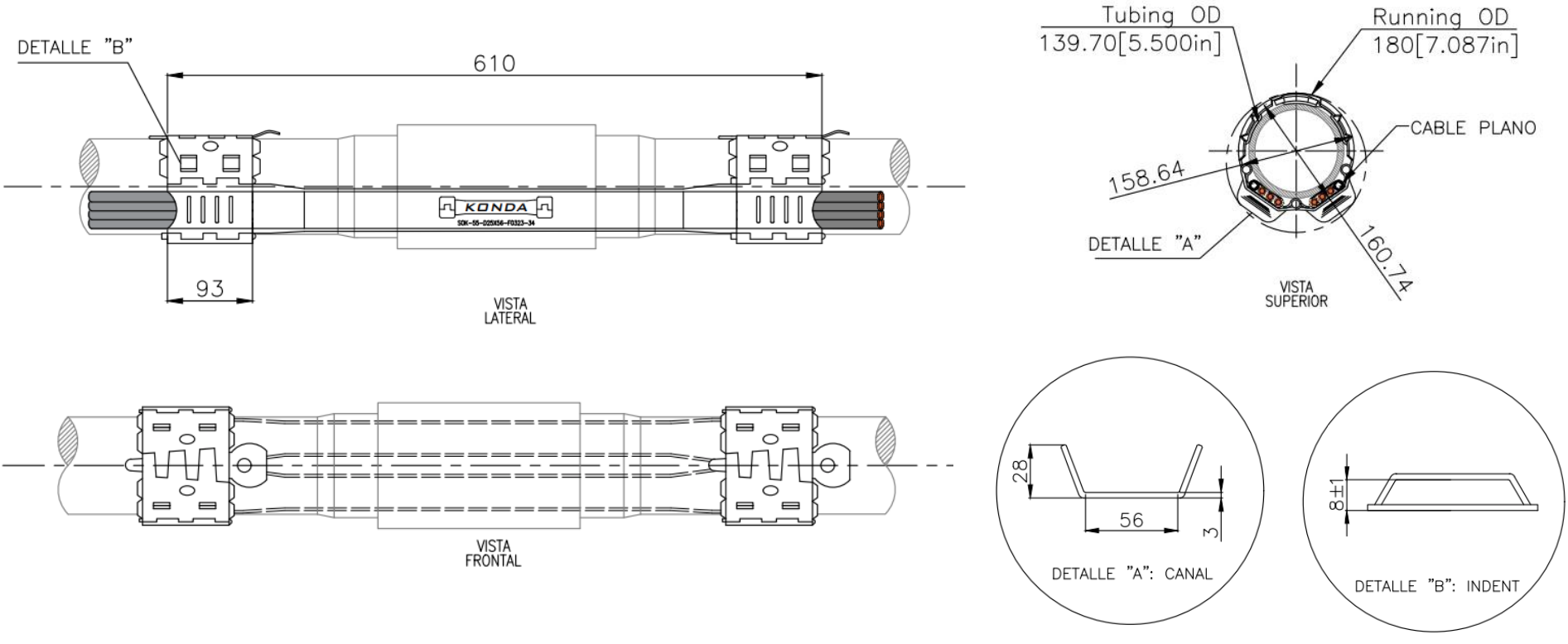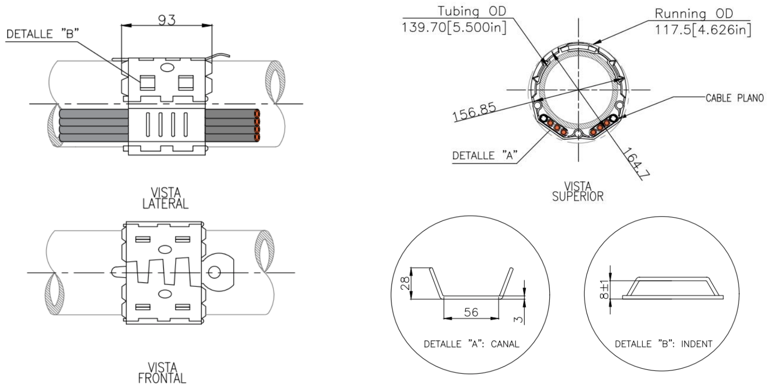Material ASTM A-36/A1011 Espesor 3 mm Aplicaciones Power Cable 1 2 4 Tipo Rosca Capilar 1 2 1 2 1 2 OD Tubería Canal 5 1/2 in 25x56 x x x Coupling EUE - VAN - N VAN - SEC - BTC Protector Mid Joint